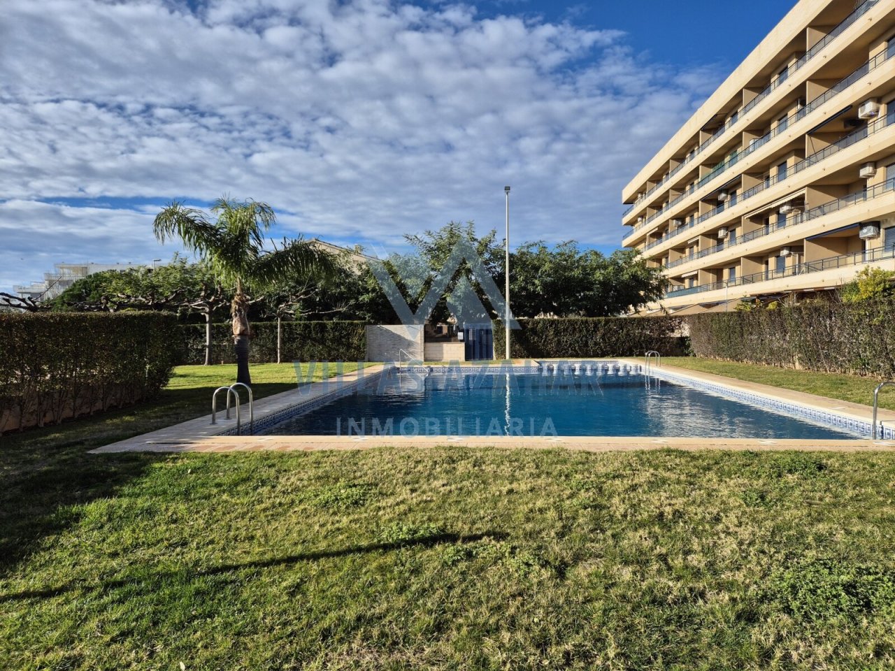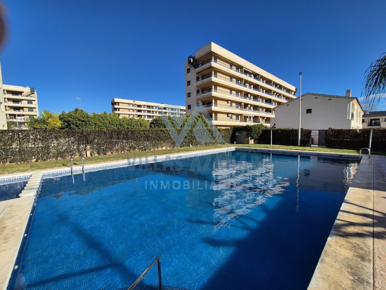 Opposite the building, residents enjoy access to a communal area with a large swimming pool and well-kept green areas.